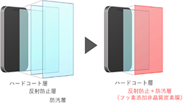 近年のスマートフォン等の製造工程では、耐擦傷・防汚・反射防止などの機能を付与するためのコーティングの積層数増加が課題となっています。そこで当研究室では、コーティングの積層数を減少させるため、単一で複数の機能を有するフッ素添加非晶質炭素膜の研究を行っています。このコーティング膜は、非晶質炭素膜にフッ素が添加されていることで膜の表面自由エネルギが低下し、水や汚れをはじく機能を持ちます。加えて、膜を形成するC-F結合は分極率が低いため薄膜の屈折率が小さく、反射を抑える機能も期待できます。
