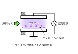 化粧品などのナノ粒子を溶媒に分散させた製品では、粒子に凝集を生じさせずに安定した分散状態を保つことが求められています。そこで、このナノ粒子に対して薄膜コーティングを行い、表面の極性を均一にすることで、分散性を高める効果を持たせることができます。また、薄膜コーティングにより、粉体の劣化防止や、有機合成色素などが持つ皮膚刺激性の低減など、化粧品に有用な機能性の向上も期待されています。一般にプラズマCVD法による薄膜コーティングは真空下で成膜を行いますが、成膜対象がナノ粒子の場合は圧力を下げる過程で吹き飛んでしまうため、真空下での成膜は困難です。そこで当研究室では、大気圧条件下でのプラズマCVD法によるナノ粒子への成膜手法について研究を行っています。